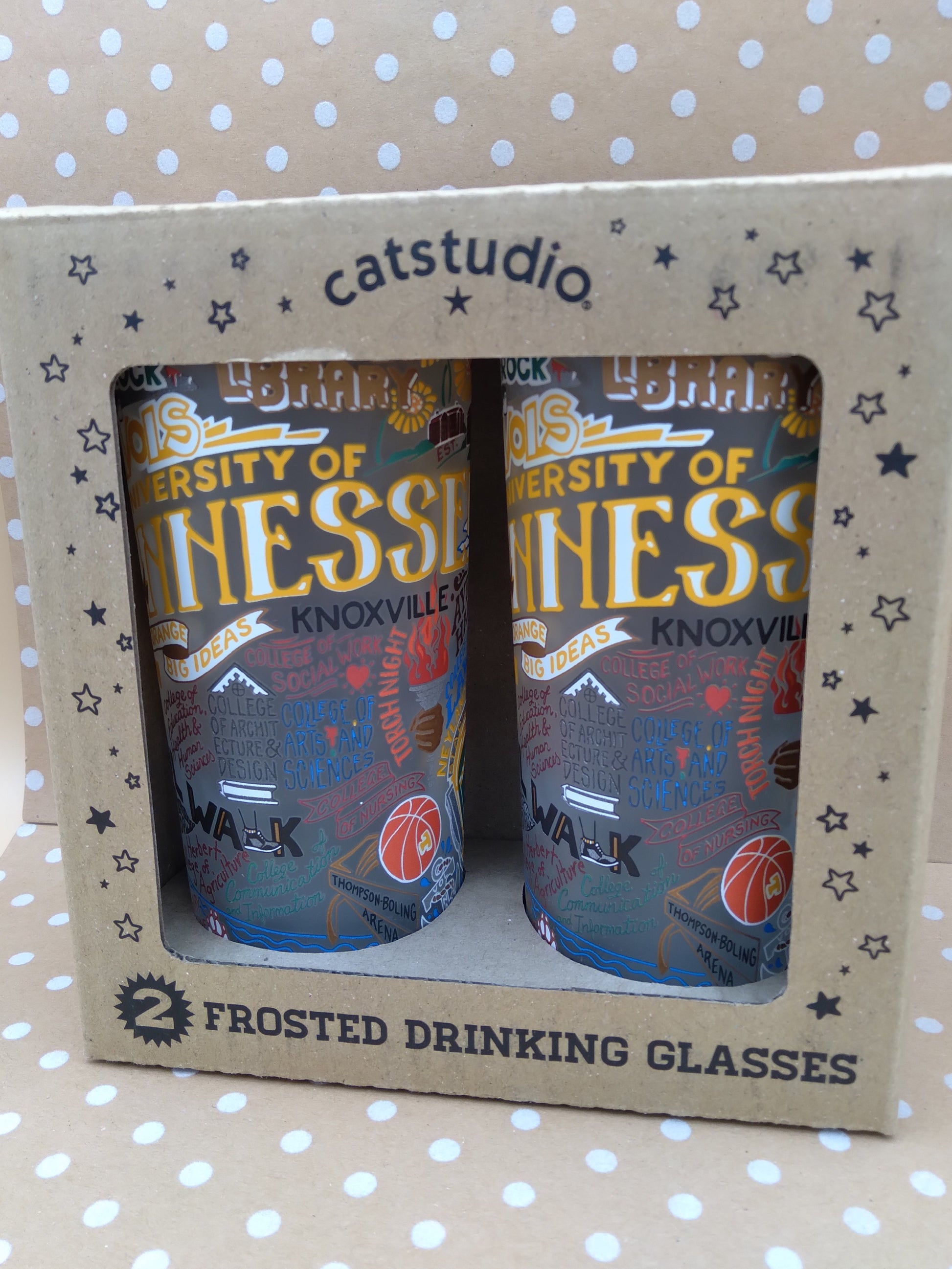 This glass set highlights landmarks, events, and symbols of the University of Tennessee.